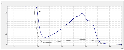 Спектры поглощения подтверждают отнесение высококипячих компонентов к С10-С13 алканам. Присуствие в спектрах поглощения ароматических соединений во фракции F1 и F2 c диапазоном кипения 175-198, указывает на отнесение данной фракции к уайт-спириту (нефрас-С4-155/200)